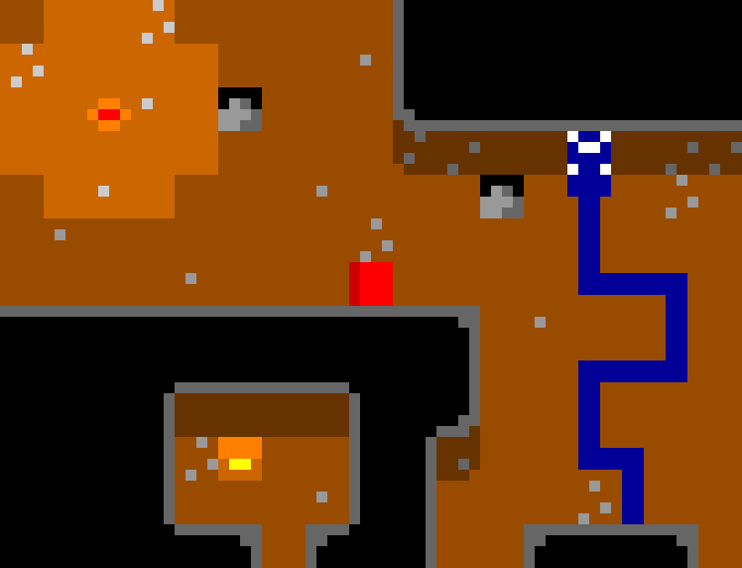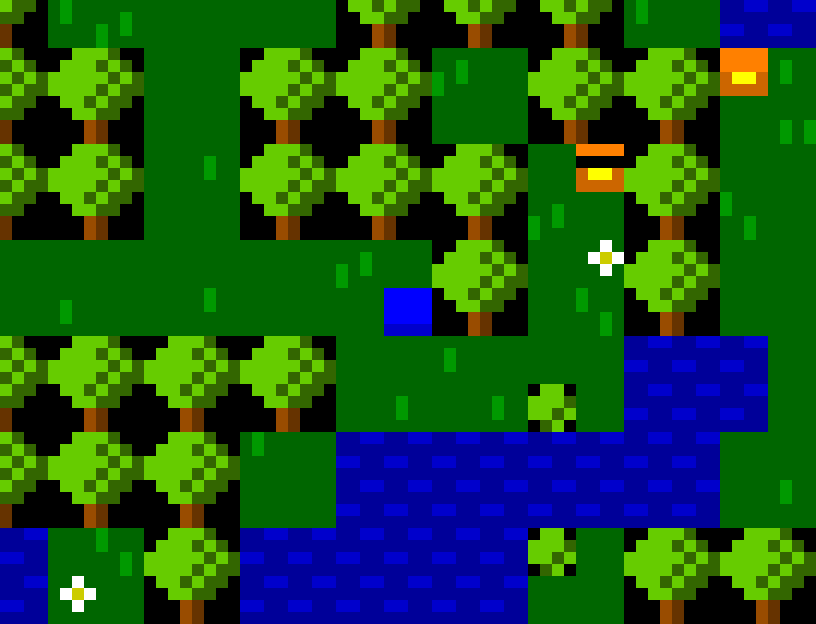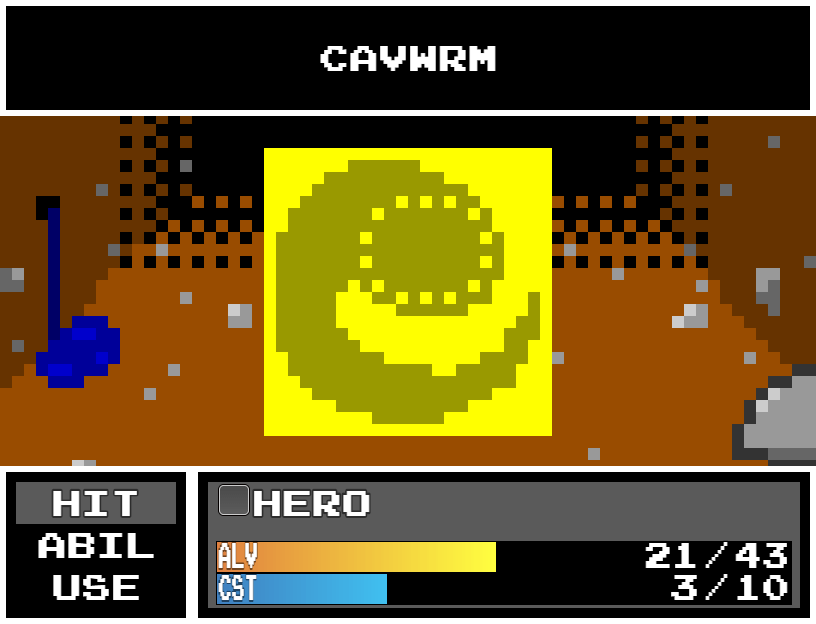 I set out with the goal of making a complete RPG with no pre-made assets, and with only a month to do so it needed to be scaled down in any way possible. Visuals were made with deliberately miniscule 4×4 tiles in a small color palette. Music was composed with only three basic sound channels, one of which could only play a single note. Names were abbreviated under fake character limits, and dialogue was spoken in several word sentences of broken English. Combat was simplified to try and get the most value out of the least number of stats, skills and items possible.